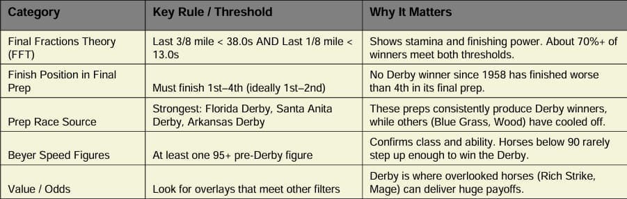 Picking a Derby winner is about integrating signals, not clinging to one. Here’s how FFT, prep location, finish position, and Beyers can work together.