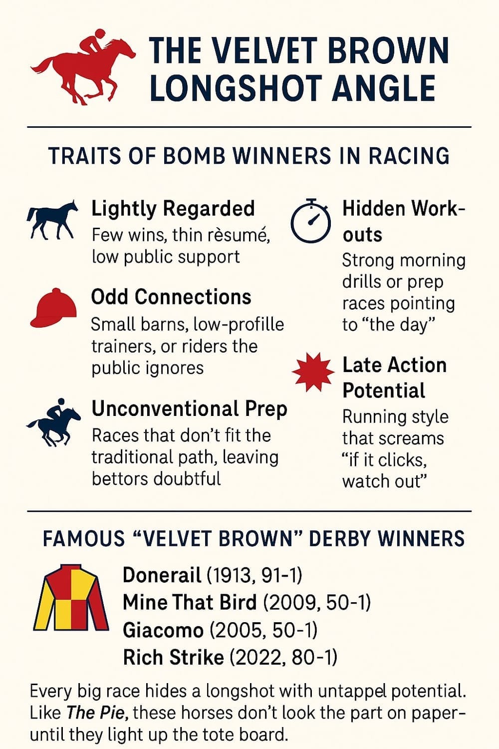 Each of these Derby bombs embodies the same “Velvet Brown longshot angle”: a horse the public ignored, but whose hidden potential erupted on the day it mattered most.